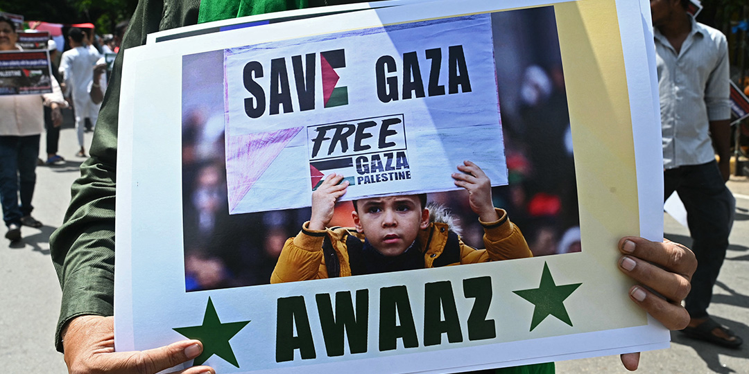 A pro-Palestinian activist holds a placards during an anti-Israel protest in Hyderabad on October 7, 2025, held to mark the second anniversary of the attack that triggered the war between Israel and the militant group Hamas. (Photo by NOAH SEELAM / AFP)