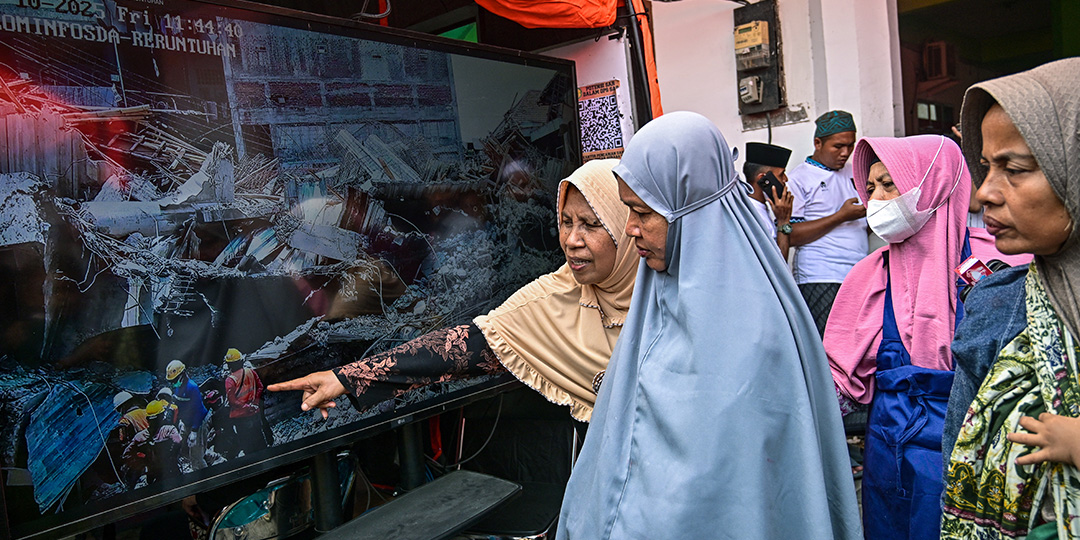 Relatives of missing students watch a video on a screen as rescue operations continue at the site of a collapsed building at the Al Khoziny Islamic boarding school in Sidoarjo, East Java province, on October 3, 2025, after a multi-storey building at the school collapsed. Part of the multi-storey boarding school in the town of Sidoarjo collapsed suddenly on September 29 as students gathered for afternoon prayers, leaving rescuers racing to find dozens missing in the rubble. (Photo by Juni KRISWANTO / AFP)