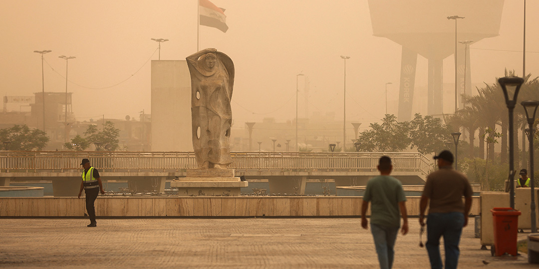 People walk in Al-Firdaws Square in Baghdad during a dust storm on May 5, 2025. (Photo by AHMAD AL-RUBAYE / AFP)