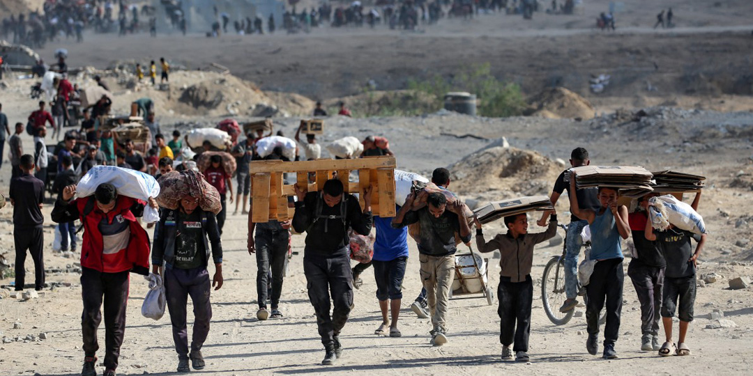 Palestinians carry bags, wooden pallets and empty cardboard boxes as they leave a food distribution point run by the US and Israeli-backed Gaza Humanitarian Foundation (GHF) group, near the Netsarim corridor in the central Gaza Strip on October 5, 2025. A senior Hamas official on October 5 said the Palestinian militant group is eager to reach an agreement to end the war and implement a prisoner swap with Israel, as negotiators converge in Egypt for talks. (Photo by Eyad BABA / AFP)