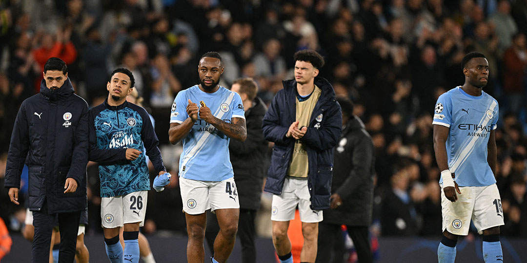 Manchester City's players react as he leaves after the UEFA Champions League, round of 16 second leg football match between Manchester City and Real Madrid at the Etihad Stadium in Manchester, north west England, on March 17, 2026. Real Madrid won the game 2-1, and the tie 5-1 on aggregate.