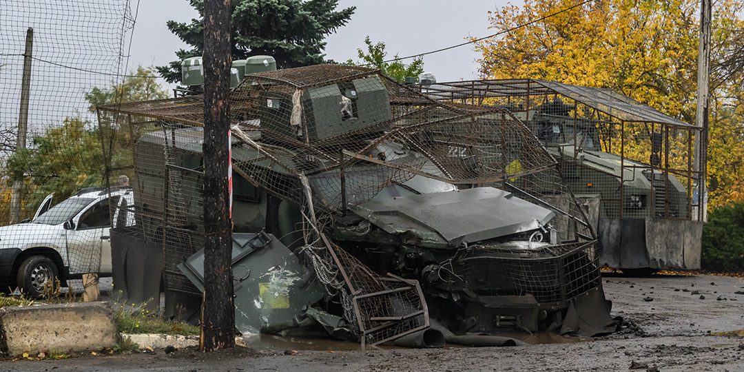 A Ukrainian armoured personnel carrier, damaged during a Russian FPV drone strike, lies at a roadside near Druzhkivka, in the Donetsk Oblast, in eastern Ukraine, on October 10, 2025. (Photo by Ed JONES / AFP)