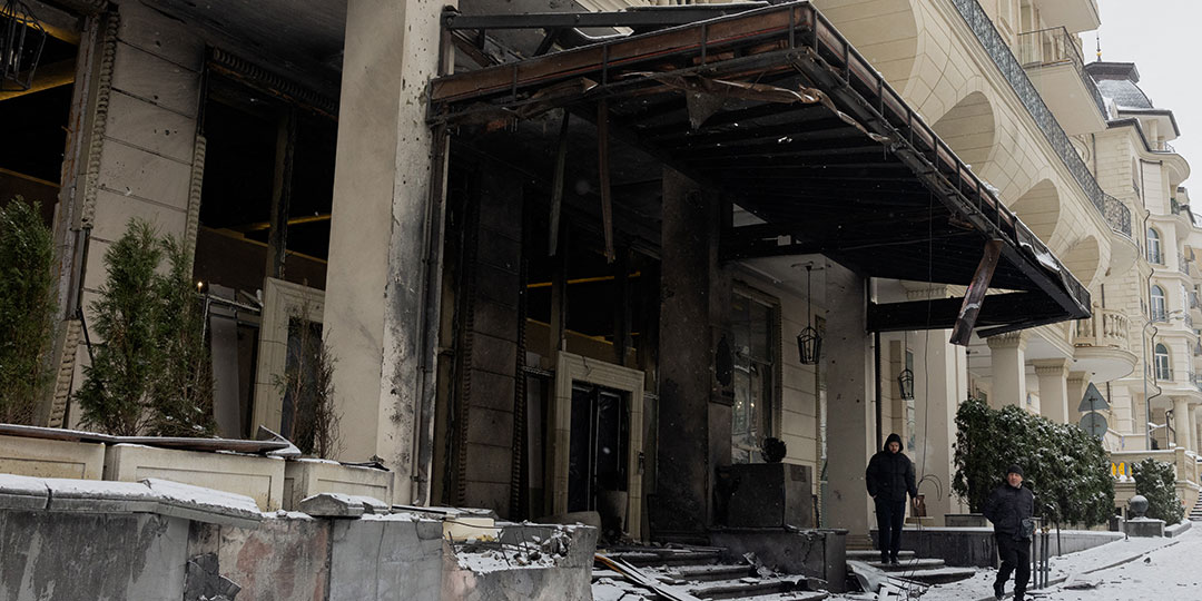 Men stand near a damaged residential complex following a Russian attacks near Qatar embassy of Ukraine in Kyiv early on January 9, 2026, amid the Russian invasion of Ukraine. Russia launched a massive attack on Ukraine's capital, setting apartment blocks alight and killing at least four people, Kyiv's police said on January 9, 2026 after Moscow rejected the latest post-war peacekeeping plan.