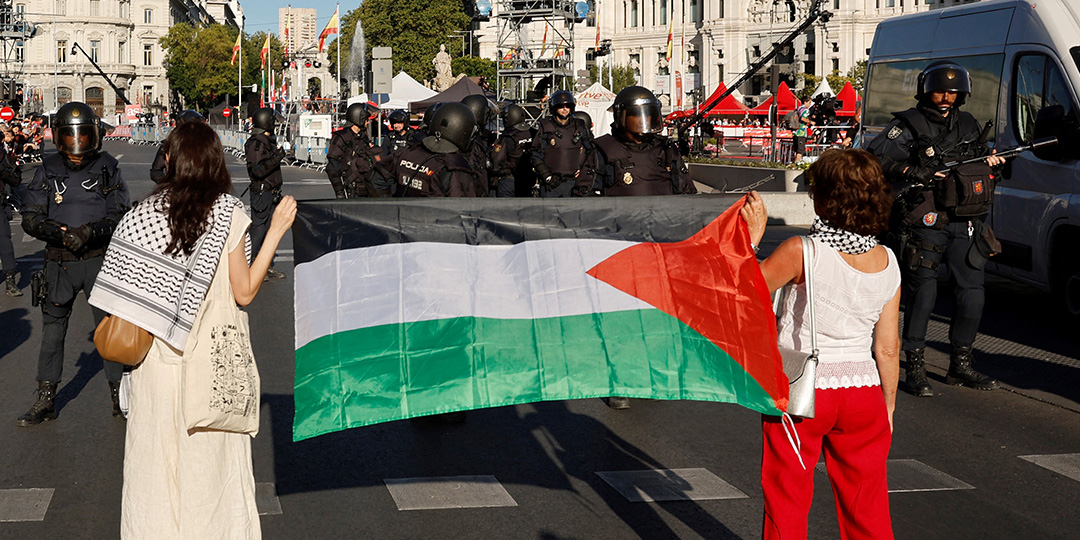 Pro-Palestinians protestors holding a Palestinian flag face police on the street during the 21st and last stage of the Vuelta a Espana 2025, a 101 km race between Alalpardo and Madrid, near Cibeles fountain in Madrid on September 14, 2025. Vuelta final stage has been abandoned because of pro-Palestinian protests, AFP reports. (Photo by Oscar DEL POZO / AFP)
