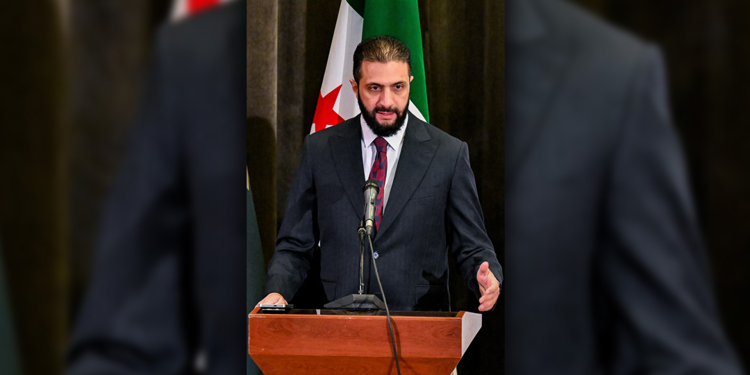 Syria's interim President Ahmed al-Sharaa speaks at a polling station where members of Syrian local committees have been casting their votes in the country's selection process to designate an interim parliament, in Damascus on October 5, 2025. Syria will select members of its first post-Assad parliament on October 5 in a process criticised as undemocratic, with a third of the members appointed by interim leader Ahmed al-Sharaa. (Photo by LOUAI BESHARA / AFP)