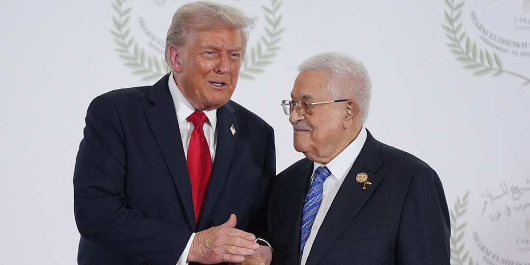 US President Donald Trump greets Palestinian president Mahmud Abbas during a summit on Gaza in Sharm el-Sheikh on October 13, 2025. Trump landed in Egypt on October 13 for a summit on Gaza, following a lightning visit to Israel after a ceasefire he brokered entered into force.