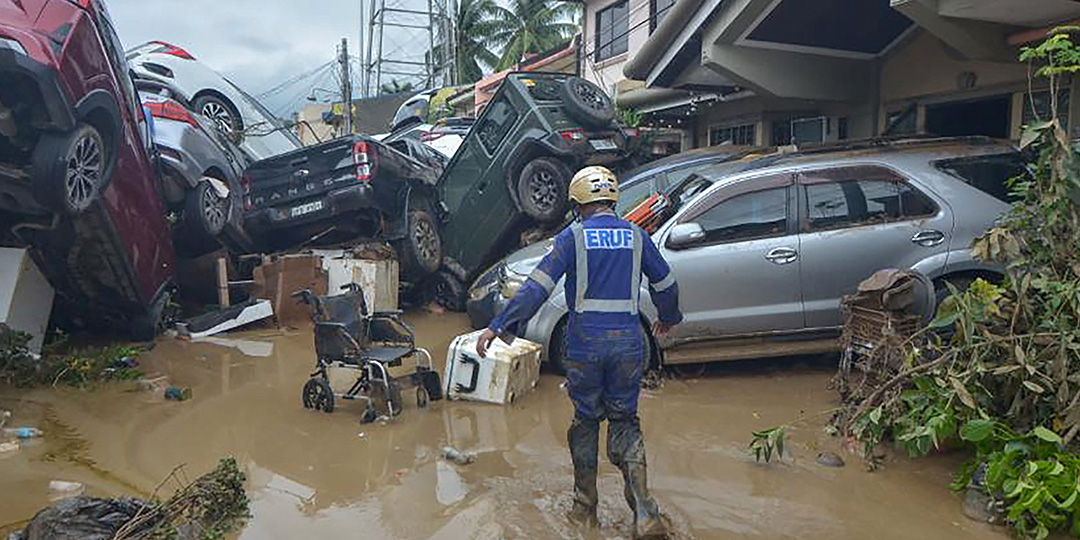 A rescuer walks past piled up cars washed away by floods at the height of Typhoon Kalmaegi in a subdivision of Cebu City in the central Philippines on November 4, 2025. Residents sought refuge on rooftops and cars floated through flooded streets on November 4 as Typhoon Kalmaegi battered the central Philippines, leaving at least two people dead.