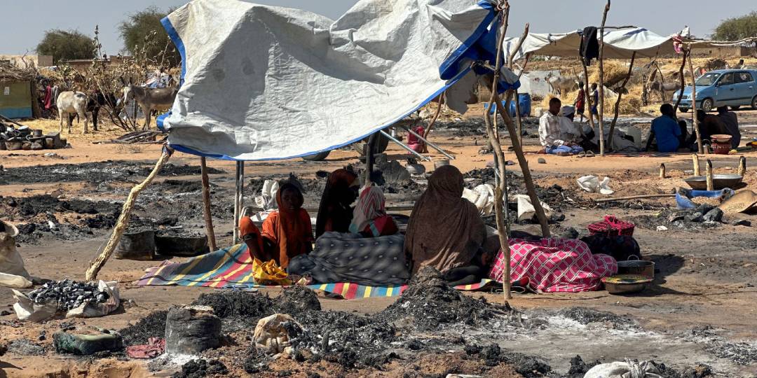 Displaced Sudanese people who left El-Fasher after its fall, sit in the shade in Tawila amid the remains of a fire that broke out in the camp on February 11, 2026. A massive fire at a displacement camp in Sudan killed one child, injured other people and left homeless hundreds who had already had to flee to escape the fighting ravaging the country. Since April 2023, the Sudanese army and the paramilitary RSF have been locked in a conflict that has killed tens of thousands and displaced nearly 12 million.