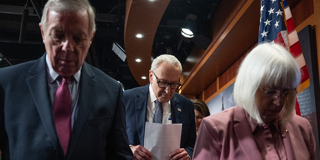 US Senate Minority Leader Chuck Schumer (D-NY) (C), US Senators Dick Durbin (D-IL) (L) and Patty Murray (D-WA) look on as they leave a press conference following a Senate vote on Capitol Hill in Washington, DC on September 30, 2025, hours before a partial government shutdown is set to take effect. The US government barreled towards its first shutdown in six years Tuesday, with funding expiring at midnight after Democrats fought a war of words with Donald Trump and senators rejected a last-ditch bid to keep the lights on. (Photo by ANDREW CABALLERO-REYNOLDS / AFP)