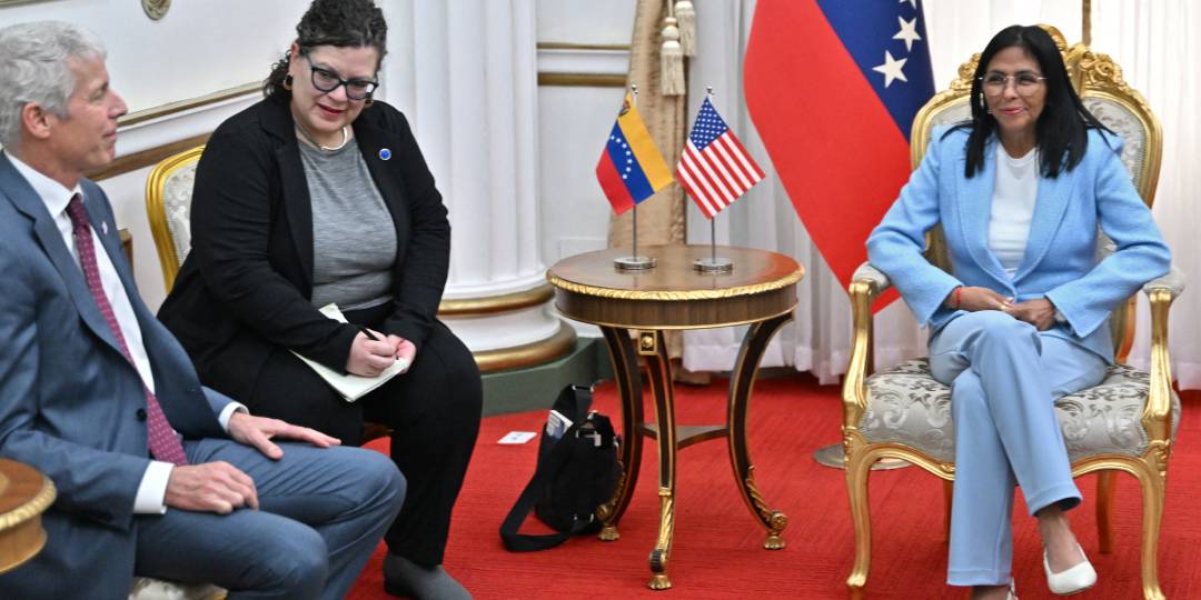 US Secretary of Energy Chris Wright (L) meets with Venezuela's acting president Delcy Rodriguez (R) at the Miraflores Presidential Palace in Caracas on February 11, 2026. US Energy Secretary Chris Wright arrived in Venezuela on February 11 for talks with acting president Delcy Rodriguez and oil industry executives on harnessing the country's vast crude reserves.