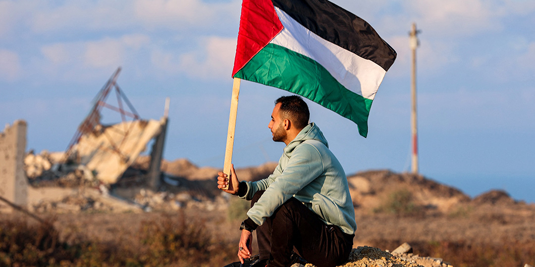TOPSHOT - A man holds a Palestinian flag as he watches displaced Gazans crossing the Netzarim corridor from the southern Gaza Strip into Gaza City on January 27, 2025. Displaced Palestinians began returning to northern Gaza on January 27, an official at the territory's Hamas-run Interior Ministry told AFP, after a breakthrough in negotiations between Hamas and Israel. (Photo by Omar AL-QATTAA / AFP)