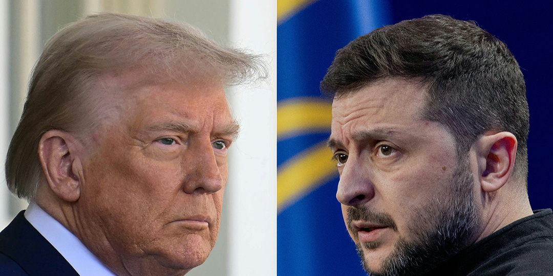 This combination of pictures created on February 25, 2025 shows US President Donald Trump (L) on February 24, 2025, and Ukraine's President Volodymyr Zelensky (R) on February 23, 2025. Zelensky urged Trump to broker peace in Ukraine like he did in the Middle East during a phone call on October 11, 2025, the Ukrainian leader said.